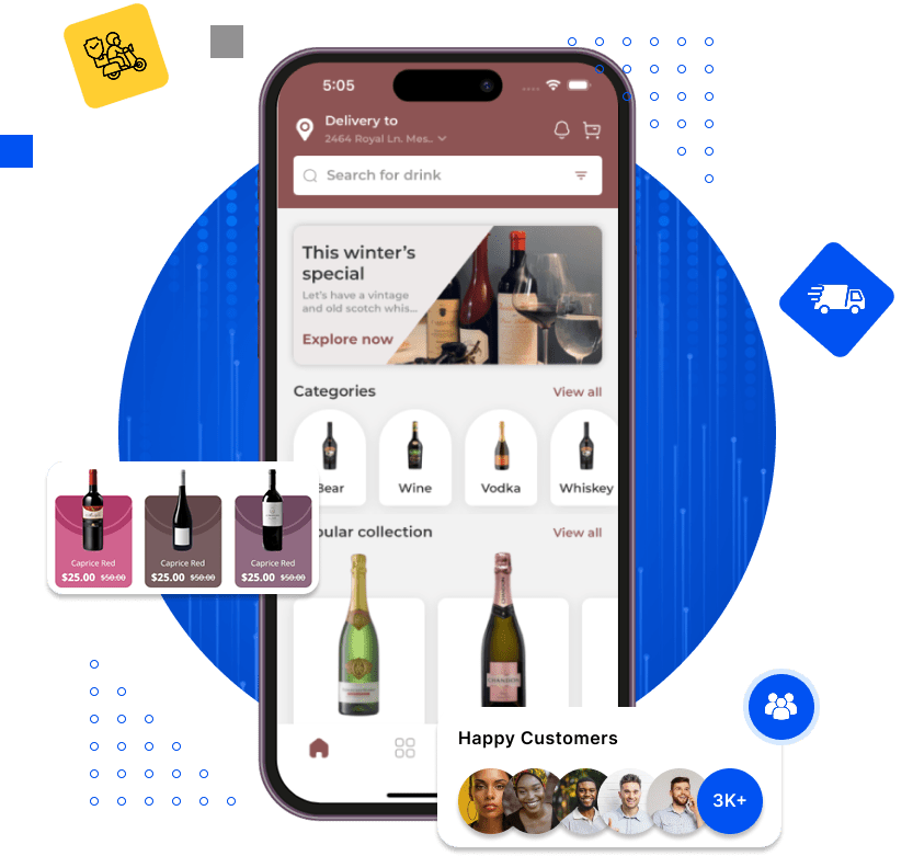 We provide a complete range of alcohol delivery application solutions. Our apps are built to work across several platforms, including iOS, Android, and the web, and can run on smartphones, tablets, etc.
