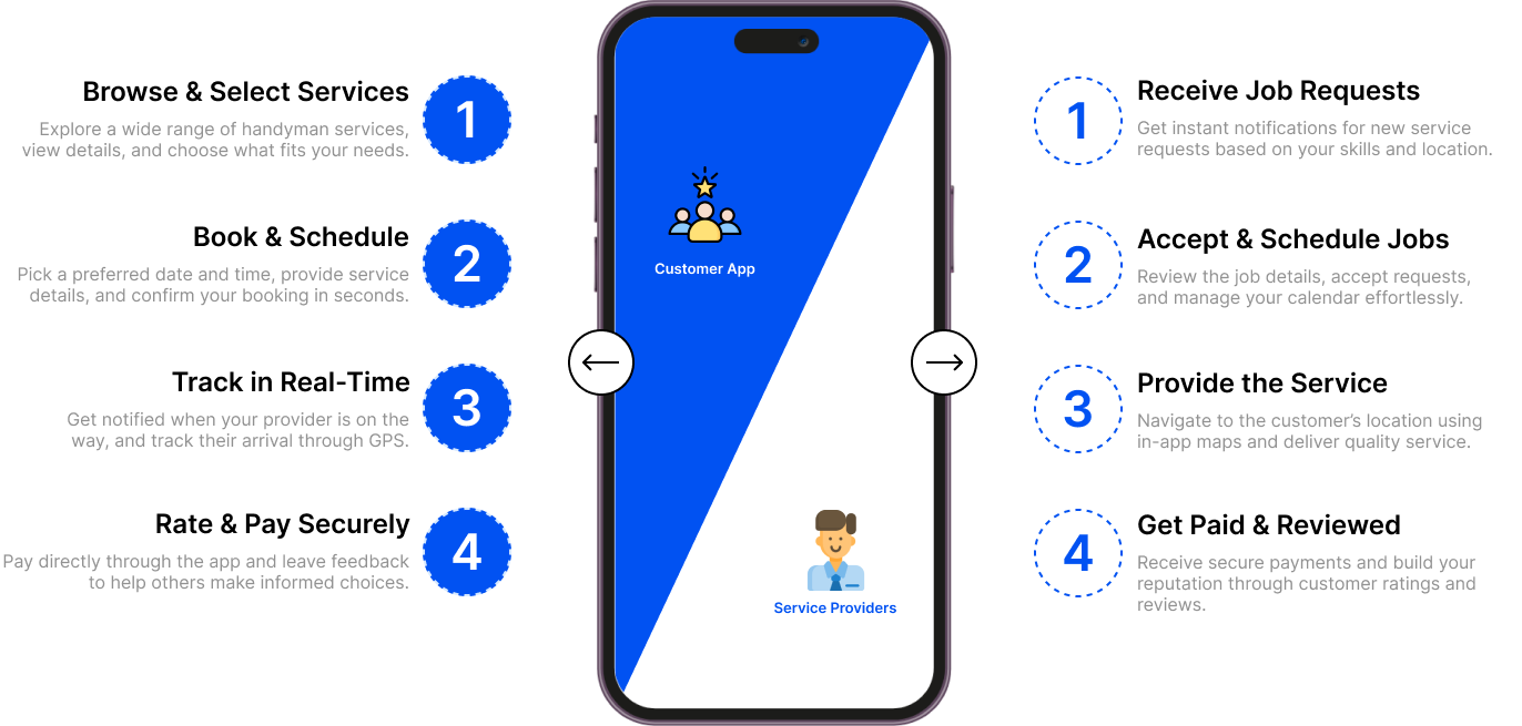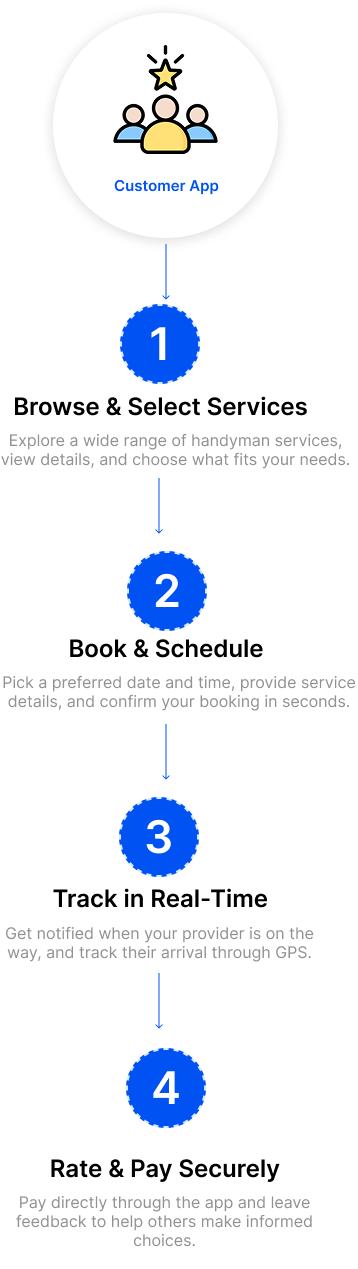 Our handyman service app is built around a seamless interaction between customers and service providers—from booking to service completion. Here's how it works: