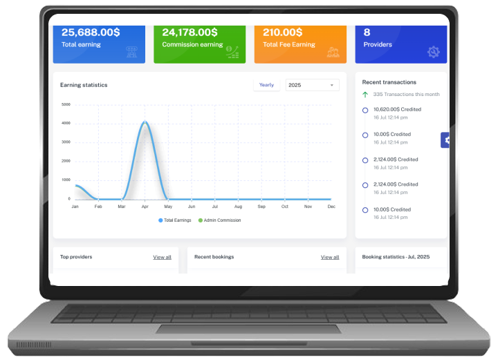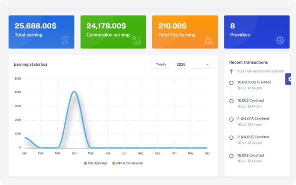Monitor all activities, revenue, user stats, and service performance at a glance.