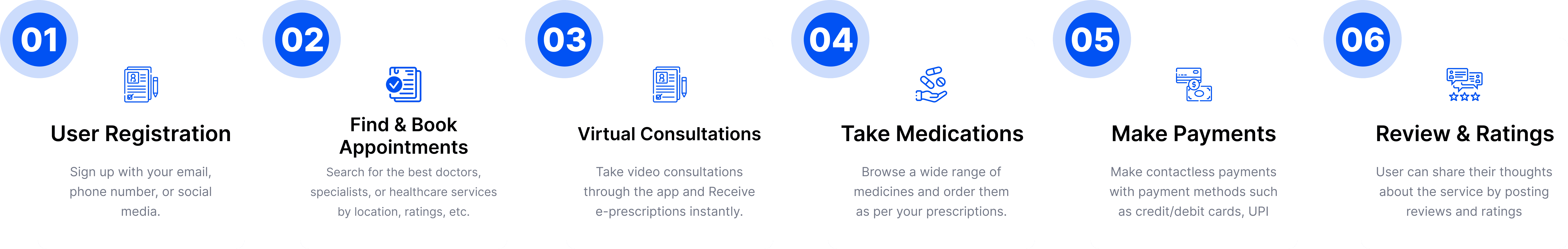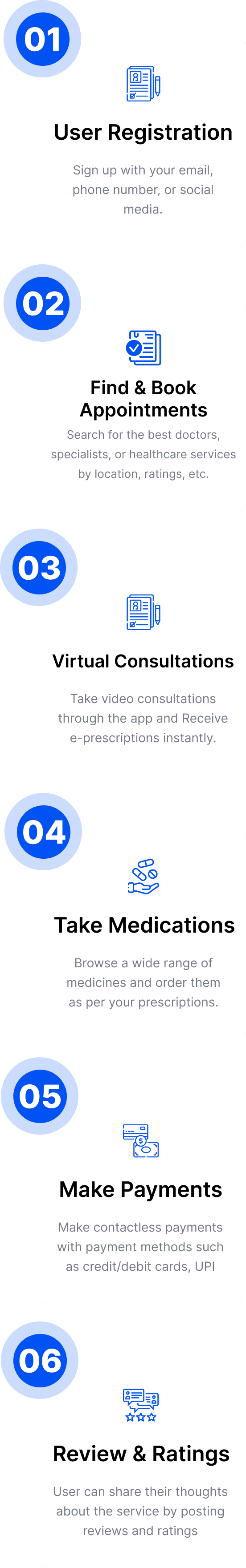 Our custom healthcare software works in a step-by-step flow to ease customer experience and boost efficiency. Here is an overview of it-