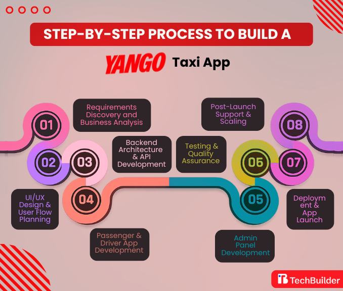Building a Yango Taxi App–style ride-hailing platform requires a structured development approach to ensure performance, scalability, and compliance with Dubai’s transportation standards. At TechBuilder, we will use an effective strategic sequence of steps that would help to convert your idea into a full-fledged, market-ready ride-hailing solution.