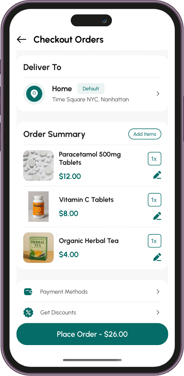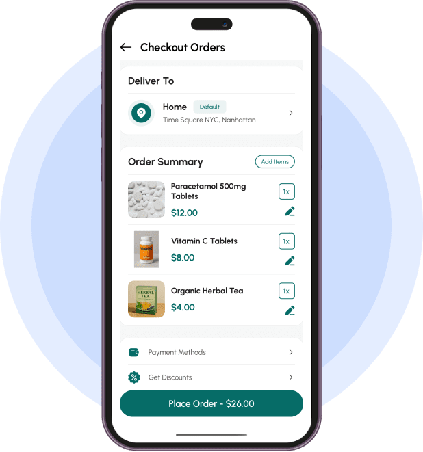 Our pharmacy delivery app accepts multiple payments such as Credit and Debit cards, E-wallets, Apple Pay, Amazon Pay, and PayPal. Also, it supports integrated SSL certification and secured payment gateways for effortless payments.