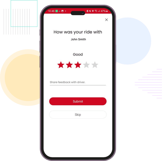 The customer panel of our pickup and delivery service app allows customers to share their experience by rating directly from the app.