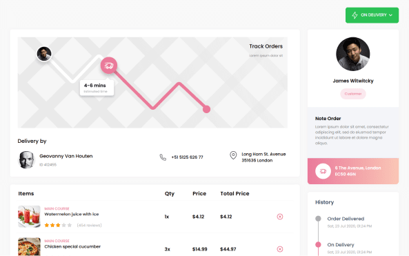 Users and administrators can see the status of their food order in real-time, such as estimated time of arrival and delivery place.