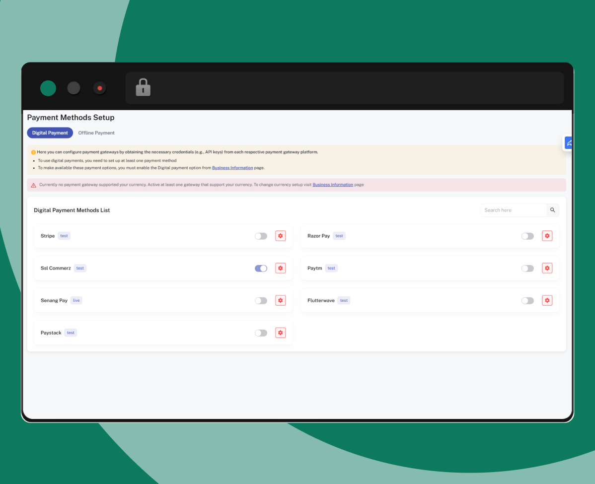 Pay cards, wallets or built-in gateways with generated invoices.