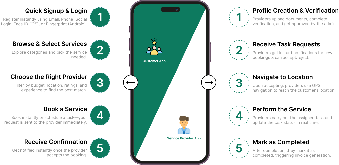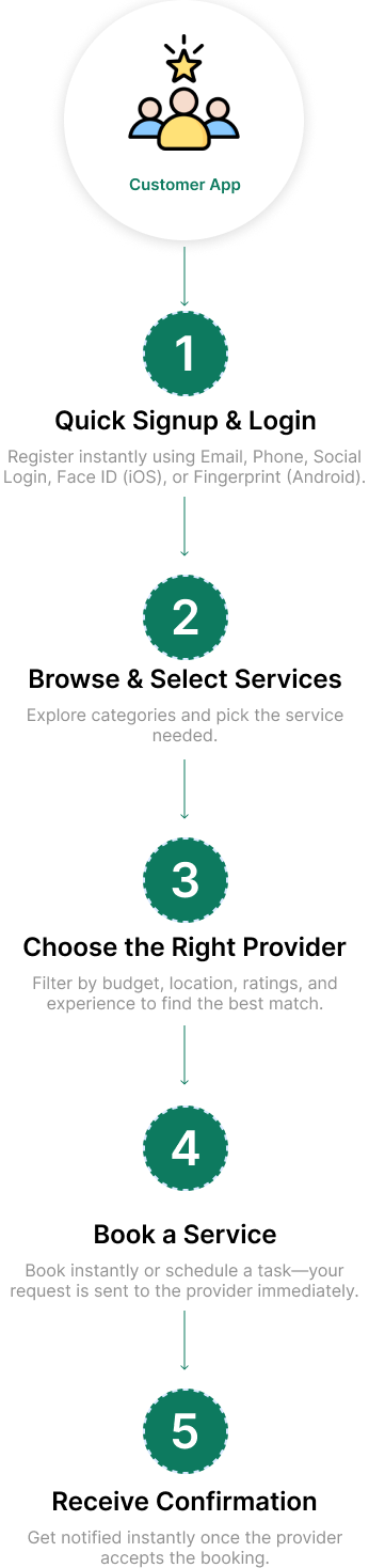 The TaskRabbit Clone App has a smooth, easy workflow that takes only a few steps to connect customers to reliable service providers.